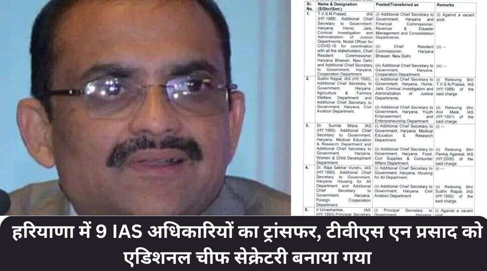 हरियाणा में 9 IAS अधिकारियों का ट्रांसफर, टीवीएस एन प्रसाद को एडिशनल चीफ सेक्रेटरी बनाया गया