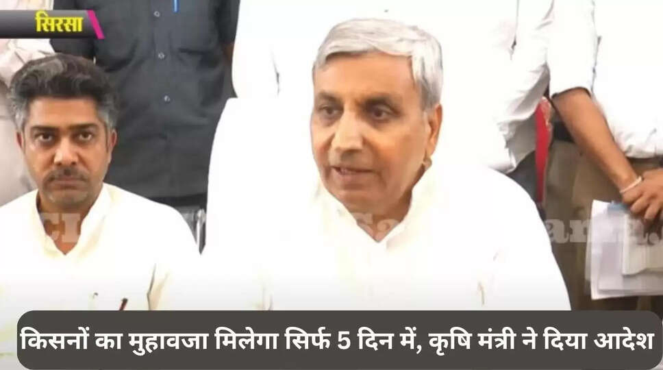 जहां पर ओलावृष्टि हुई हैओर किसानों की फसल बर्बाद हो गई। उसके ऊपर किसी मंत्री ने बताया कि 5 दिन के अंदर जमीदारों का मुहावजा उनके खाते में आ जाएगा। ऐसा आश्वासन हरियाणा के किस मंत्री ने दिया है। पत्रकारों ने कृषि मंत्री से सवाल किया कि सीएम साहब कह रहे थे कि मई महीने में जो है वह जमीदारों का मुहावजा आ जाएगा। इस पर किसी मंत्री ने कहा कि अभी माई के 5 दिन और बाकी है इन 5 दिनों के अंदर जो मुहावजा अभी पेंडिंग पड़ा है। किसानों का उनके खातों में डाल दिया जाएगा । अधिकारियों को जो है आदेश दे दिए गए हैं। जल्द से जल्द किसानों के खातों में मुआवजे की राशि है वह आवंटित कर दी जाएगी।