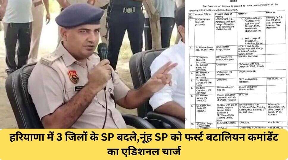 हरियाणा में 3 जिलों के SP बदले,नूंह SP को फर्स्ट बटालियन कमांडेंट का एडिशनल चार्ज,19 IPS-9 HPS अफसरों की जिम्मेदारी बदली