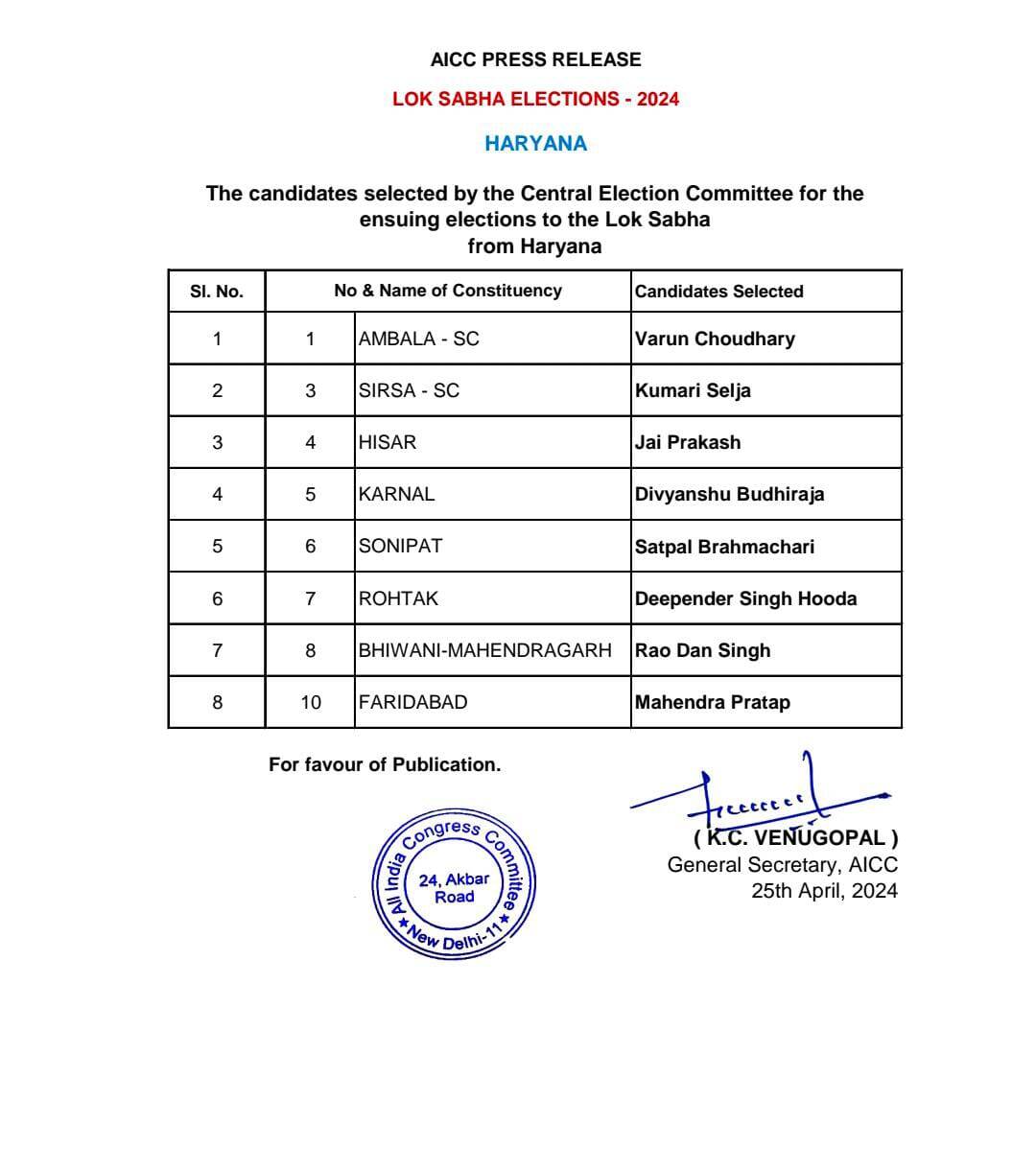 Big breaking News हरियाणा कांग्रेस ने ज़ारी की 8 उमीदवारों की लिस्ट ज़ारी सैलजा दीपेंद्र हुडा और जे पी समेत ये नाम