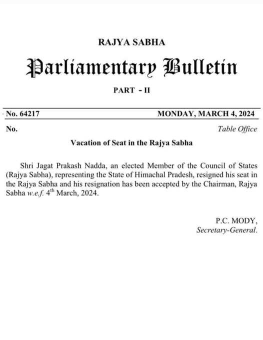 BJP national president J.P. Nadda resigns from his post as Rajya Sabha MP from Himachal Pradesh