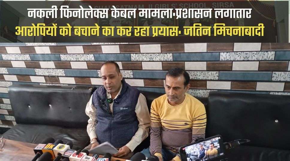 सिरसा। सिरसा में ट्यूबवैल कनैक्शनों में अधिकारियों और ठेकेदारों द्वारा नकली केबल लगाने के मामले में फिनोलैक्स कंपनी के एजेंसी संचालक जतिन मिचनाबादी ने वीरवार को मीडिया से बातचीत में गंभीर आरोप लगाए। उनके साथ नीटू कुमार भी मौजूद थे। उन्होंने कहा कि इस मामले में केवल कुछ अधिकारियों और ठेकेदारों के खिलाफ कार्रवाई की गई है, जबकि असली दोषी आज भी खुलेआम घूम रहे हैं और प्रशासन मामले को दबाने में जुटा हुआ है। मिचनाबादी ने बताया कि यह मामला 31 दिसंबर 2021 को एफआईआर दर्ज होने के बाद से ही विवादों में है।