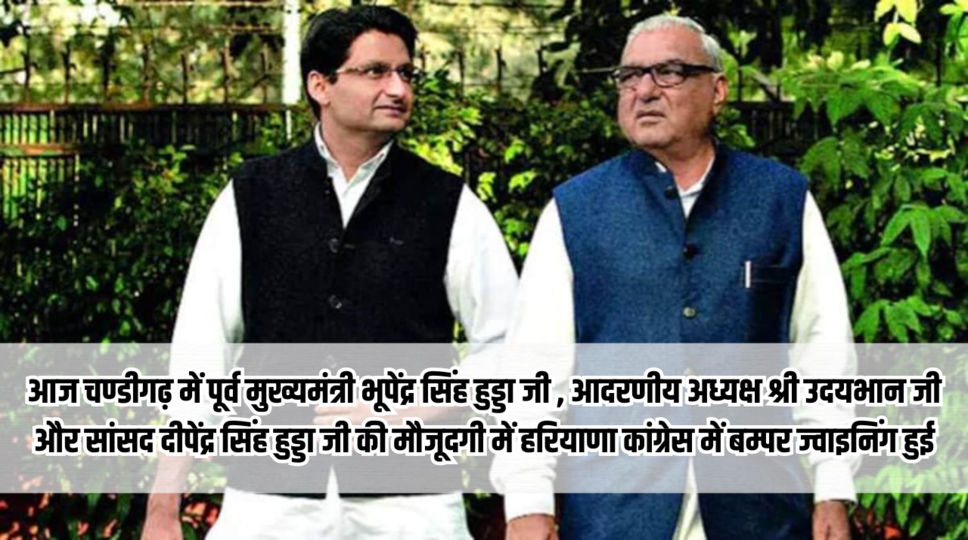 आज चण्डीगढ़ में पूर्व मुख्यमंत्री भूपेंद्र सिंह हुड्डा जी , आदरणीय अध्यक्ष श्री उदयभान जी और सांसद दीपेंद्र सिंह हुड्डा जी की मौजूदगी में हरियाणा कांग्रेस में बम्पर ज्वाइनिंग हुई