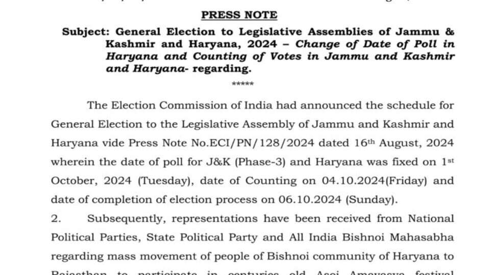 हरियाणा में चुनाव की तारीख बढ़ी, अब 5 अक्टूबर को होगा चुनाव