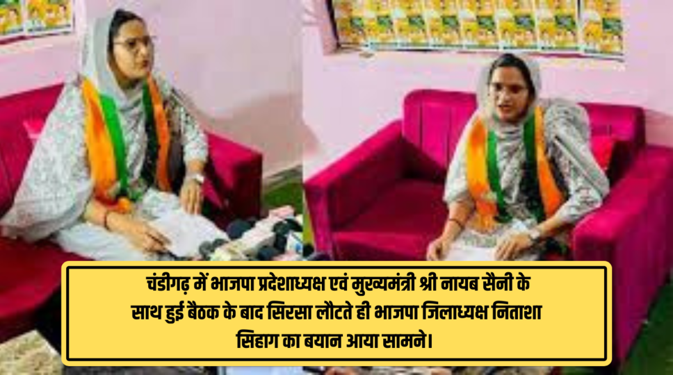 चंडीगढ़ में भाजपा प्रदेशाध्यक्ष एवं मुख्यमंत्री श्री नायब सैनी के साथ हुई बैठक के बाद सिरसा लौटते ही भाजपा जिलाध्यक्ष निताशा सिहाग का बयान आया सामने।
