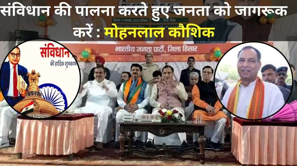हिसार। भारतीय जनता पार्टी के प्रदेश अध्यक्ष मोहनलाल कौशिक ने कहा है कि पार्टी पदाधिकारी व कार्यकर्ता संविधान दिवस पर विधि द्वारा सुझाए गए संविधान की पालना करने करेें व आम जनता को भी जागरूक करें। उन्होंने कहा कि संविधान दिवस पर आज पूरे देशभर में कार्यक्रम हो रहे हैं।