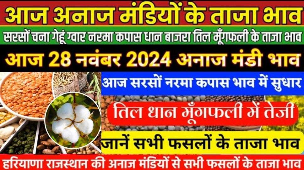 अनाज मंडी भाव| 28 Nov 2024 आज सरसों नरमा कपास भाव में सुधार| तिल मूँगफली में तेजी| सभी फसलों के भाव,