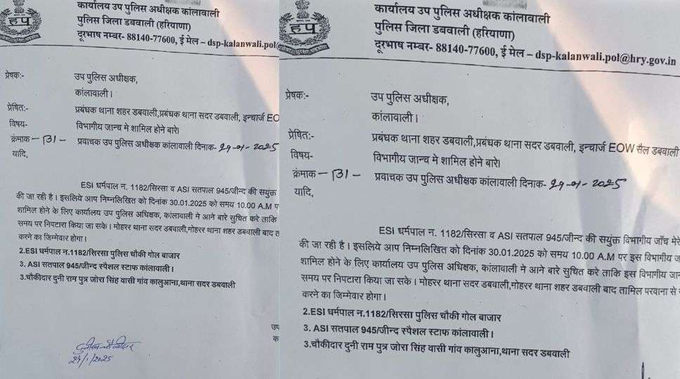 कष्ट निवारण मिटिंग की सूचना से डबवाली पुलिस के हाथ पांव फूले। कालुआना में अवैध हरे पेड़ कटाई मामले में दूनी राम ग्रामीण चौकीदार को शामिल जांच करने कालांवाली डीएसपी ने आनन फानन में लेटर जारी किया।