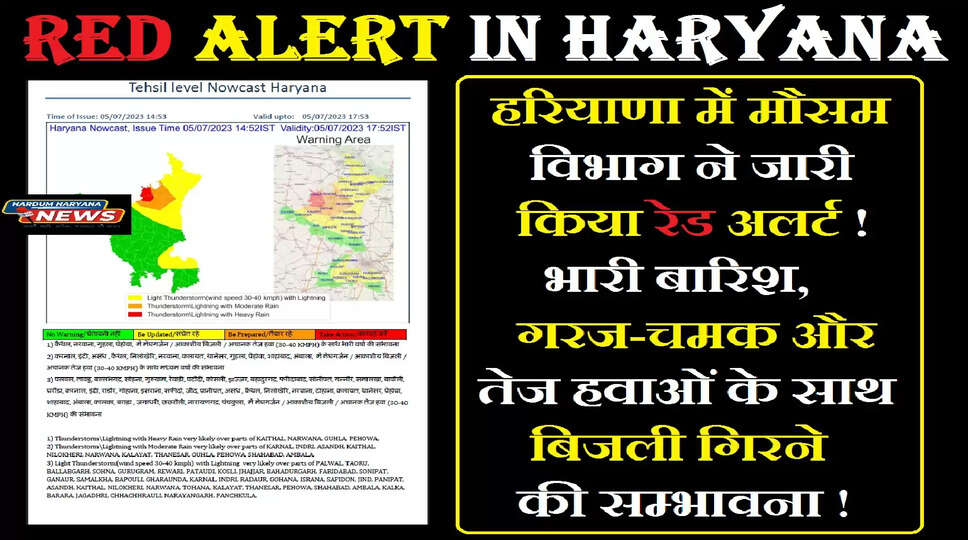 हरियाणा में मौसम विभाग ने जारी किया रेड अलर्ट ! भारी बारिश, गरज-चमक और तेज हवाओं के साथ बिजली गिरने की सम्भावना !