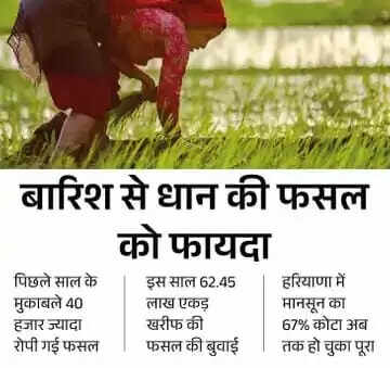 पिछले साल 61.57 लाख एकड़ में बिजाई हुई थी, जो इस बार बढ़कर 62.45 लाख एकड़ पर पहुंच गई है। धान की बुआई का लक्ष्य इस बार 30 लाख एकड़ है, जो अधिक बारिश होने के कारण 30.47 लाख एकड़ तक पहुंच गया है।