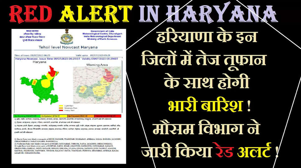 IMD की ओर से बताया गया है कि 9 जुलाई को उत्तर हरियाणा के जिलों में बहुत भारी बारिश की संभवना है। इसके अलावा शेष हरियाणा में भी अनेक स्थानों पर भारी वर्षा हो सकती है।