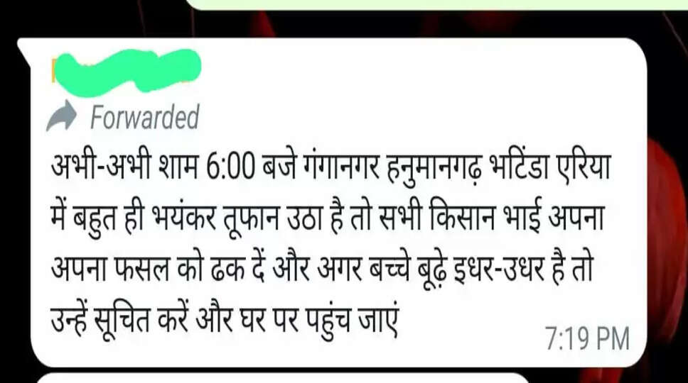 अभी-अभी शाम 6:00 बजे गंगानगर हनुमानगढ़ भटिंडा एरिया में बहुत ही भयंकर तूफान उठा है तो सभी किसान भाई अपना अपना फसल को ढक दें और अगर बच्चे बूढ़े इधर-उधर है तो उन्हें सूचित करें और घर पर पहुंच जाएं