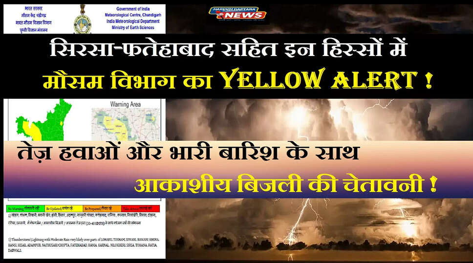 Yellow Alert: सिरसा-फतेहाबाद सहित इन हिस्सों में मौसम विभाग का Alert ! तेज़ हवाओं और भारी बारिश के साथ आकाशीय बिजली की चेतावनी !